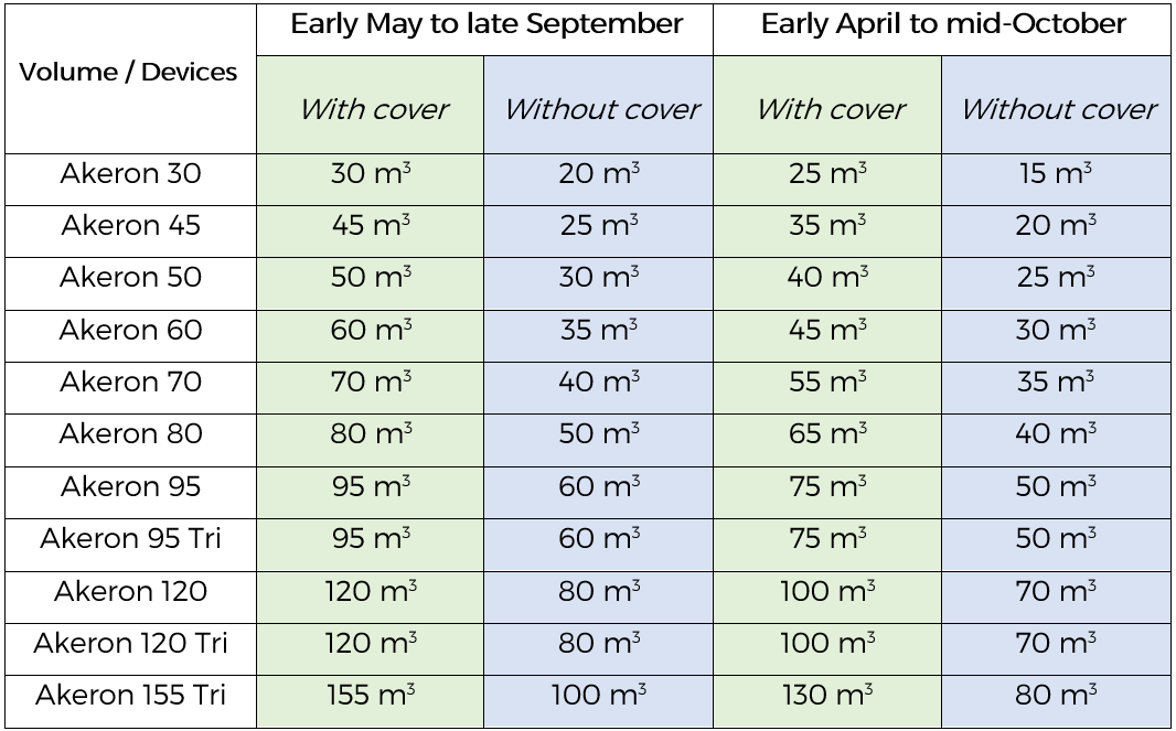 This table allows you to choose the heat pump AKERON Full Inverter you need depending on the volume of your pool for a water at 28°C in a temperate zone.